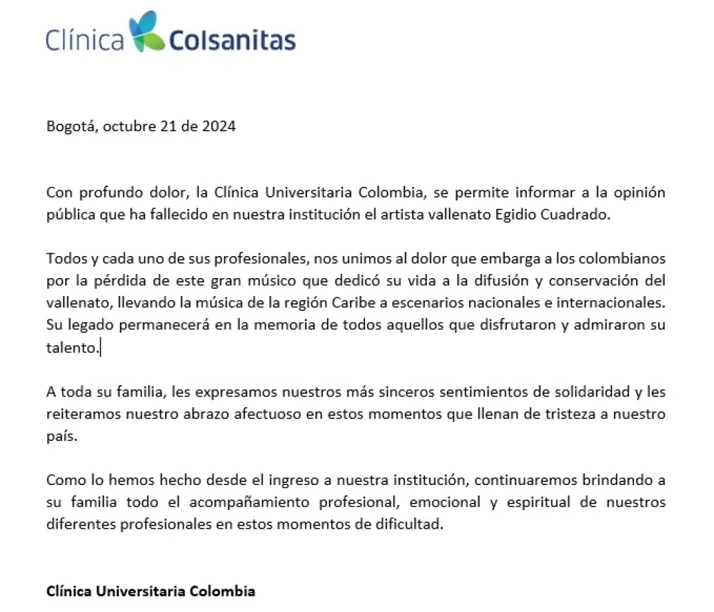 La Clínica Universitaria Colombia emitió un emotivo comunicado en el que expresó su pesar por la pérdida del maestro Cuadrado: "Todos y cada uno de nuestros profesionales nos unimos al dolor de los colombianos por la partida de este gran músico, quien dedicó su vida a la difusión del vallenato, llevando la música del Caribe colombiano a escenarios nacionales e internacionales. Su legado vivirá en los corazones de quienes admiraron su talento."